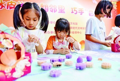 10月5日,在江苏省无锡经开区太湖街道方庙社区举办的迎中秋主题活动上,小朋友体验制作月饼。新华社发