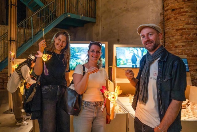 在意大利威尼斯,参观者在第19届威尼斯国际建筑双年展主题馆“塱头实验”展区展示现场领取的岭南鱼灯纪念品(2025年5月10日摄)。