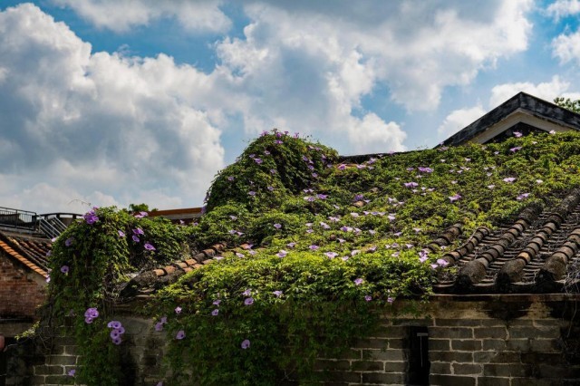 塱头村内一古屋顶上爬满植物(9月13日摄)。