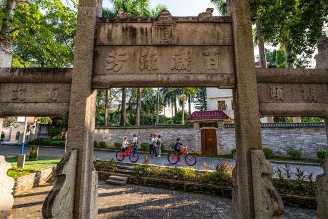 9月13日,孩子们骑车经过塱头村的升平人瑞牌坊。画面中部远处白色建筑是春阳台艺文中心。