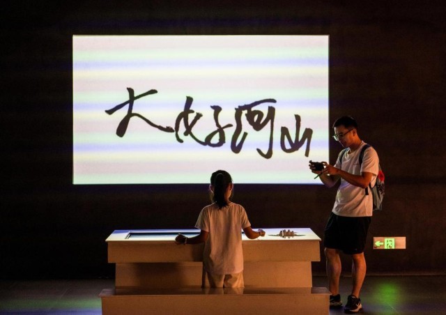 9月13日,游客带孩子在塱头村的春阳台艺文中心体验书法互动装置。