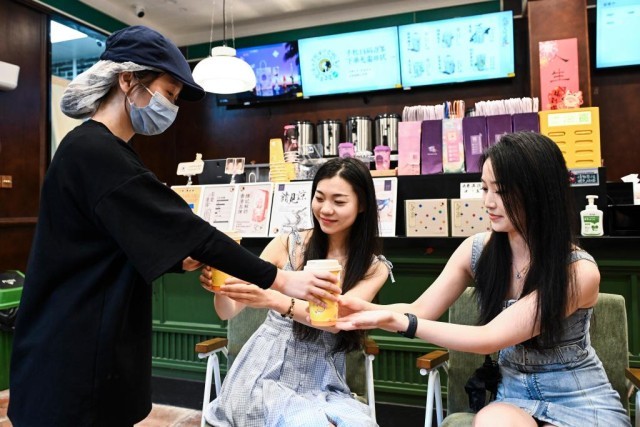 9月12日,村民黄绮雯(左)在塱头古村的一家奶茶店将饮品递给顾客。