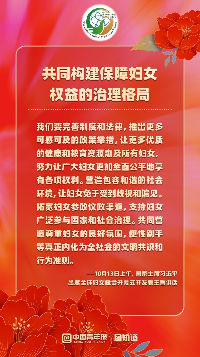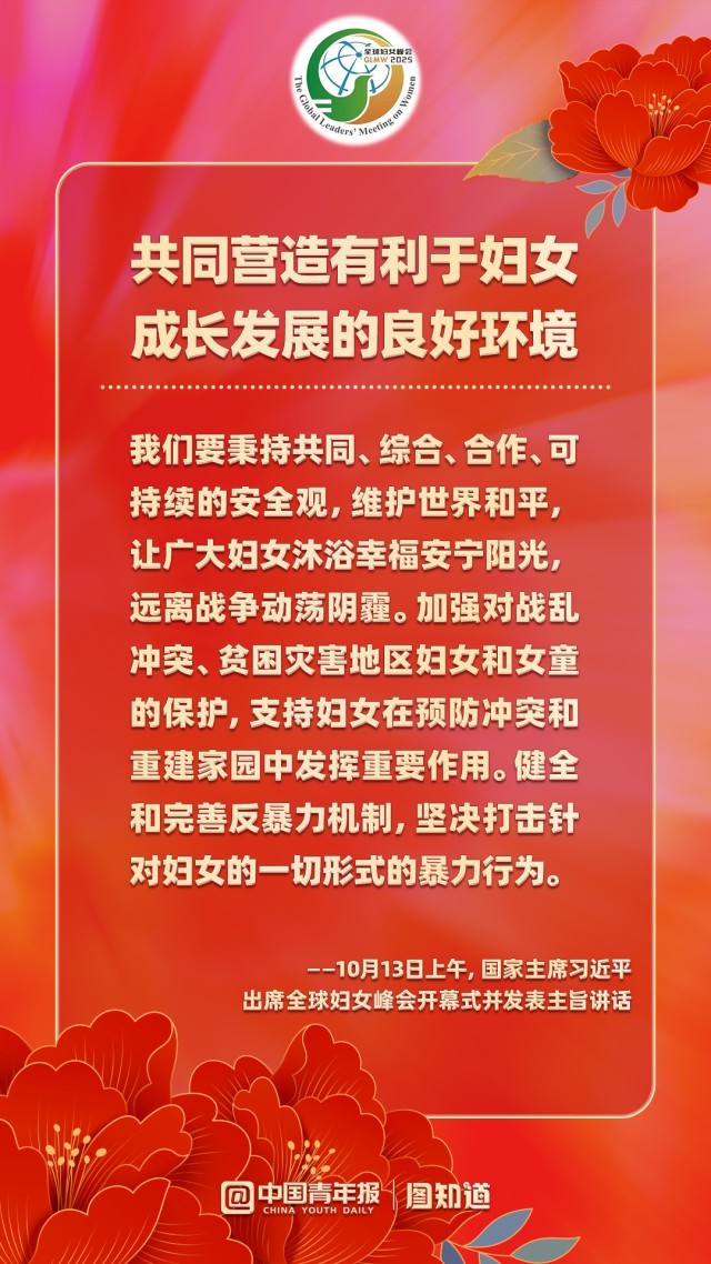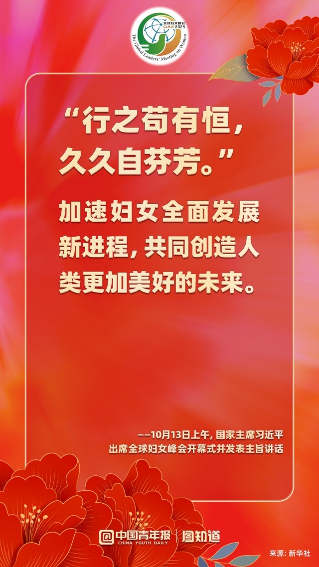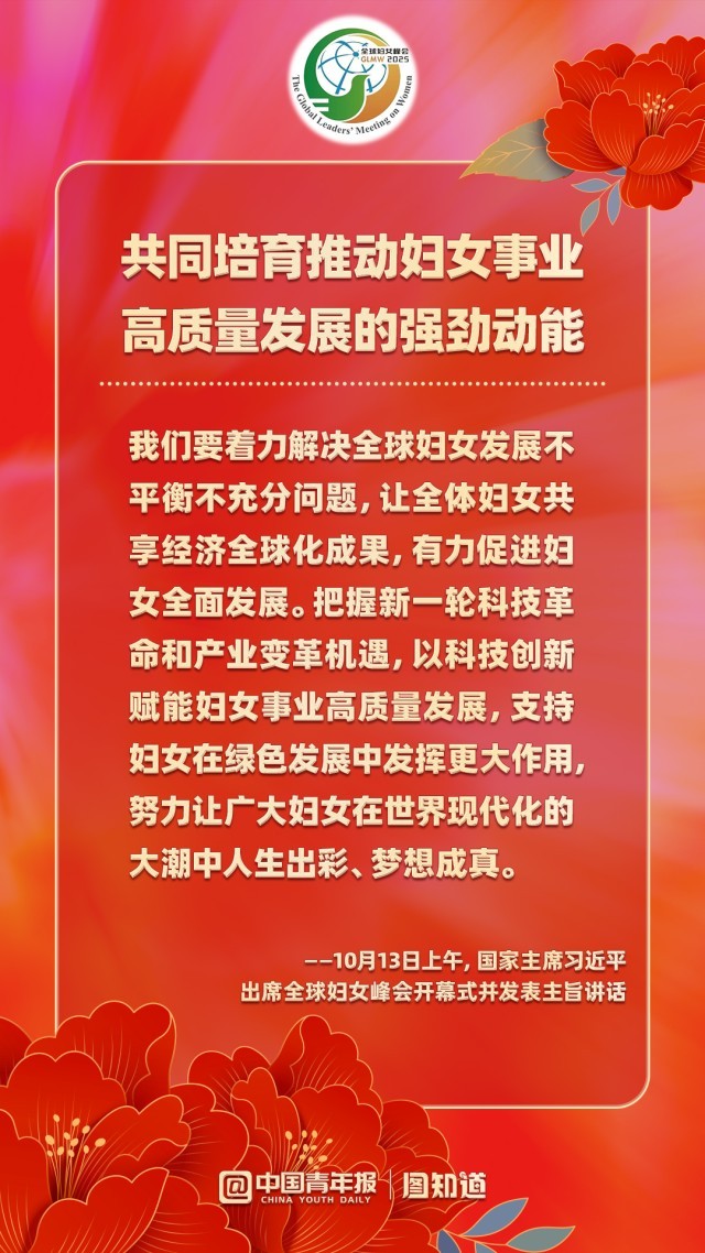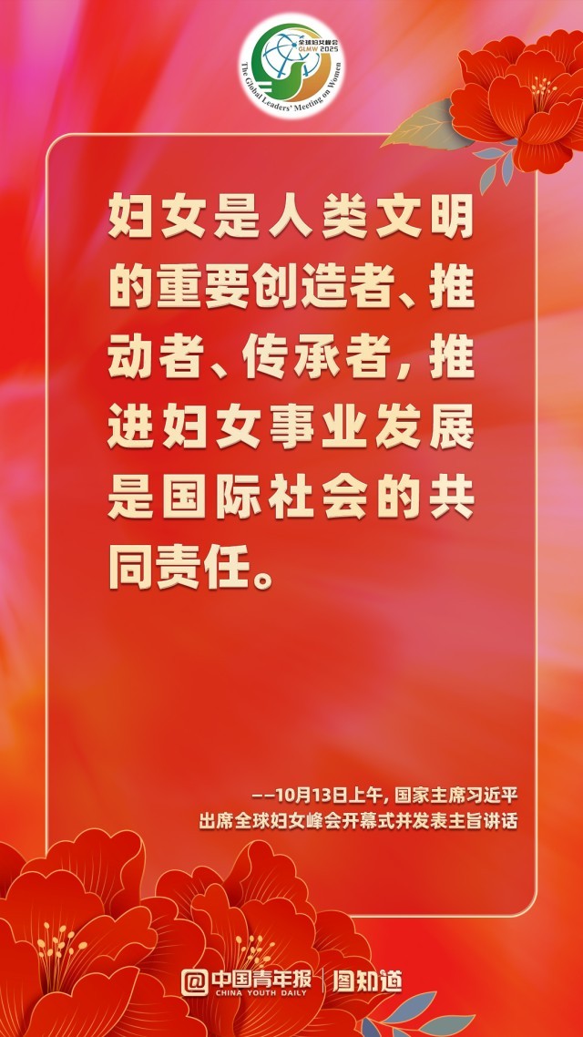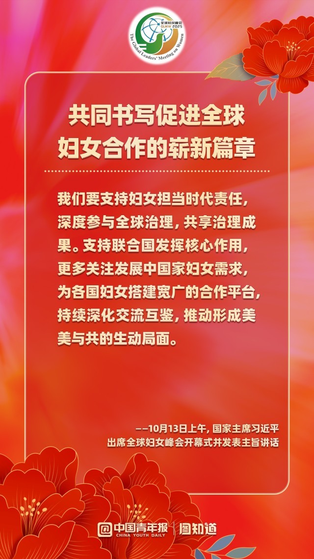 10月13日上午,国家主席习近平在北京国家会议中心出席全球妇女峰会开幕式并发表主旨讲话。他指出,未来5年,中方将再向联合国妇女署捐款1000万美元;提供1亿美元全球发展和南南合作基金额度,同国际组织合作实施促进妇女和女童发展合作项目;以妇女和女童为优先受益对象,在民生发展领域援助1000个“小而美”项目;邀请5万名妇女来华交流研修;设立“全球妇女能力建设中心”,同相关国家和国际组织开展妇女领域能力建设等发展合作,培养更多女性杰出人才。一起学习!
