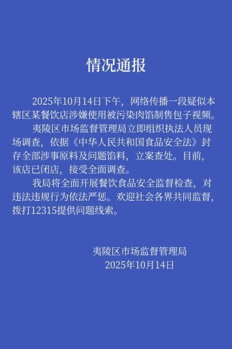 中新网10月15日电 据“夷陵市场监管”微信公众号消息,湖北省宜昌市夷陵区市场监督管理局日前发布情况通报称,10月14日下午,网络传播一段疑似该辖区某餐饮店涉嫌使用被污染肉馅制售包子视频。夷陵区市场监督管理局立即组织执法人员现场调查,依据《中华人民共和国食品安全法》封存全部涉事原料及问题馅料,立案查处。目前,该店已闭店,接受全面调查。