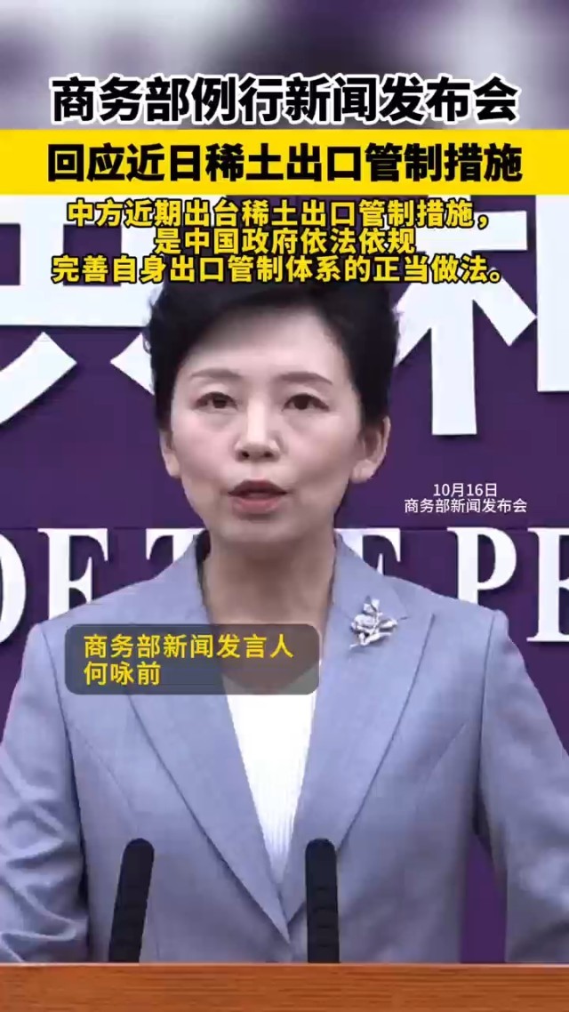 中国青年报客户端北京10月16日电(中青报·中青网见习记者刘佳佳 杨蕾 记者卢健)对于近日的稀土出口管制问题,商务部新闻发言人何咏前今天在商务部例行新闻发布会上回应说,目的是防止稀土非法外流,非法流向大规模杀伤性武器等不当用途,“更好维护中国国家安全和全球共同安全。”