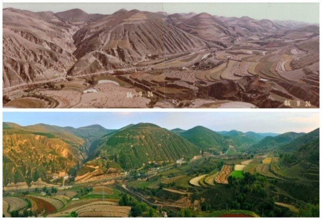 吴起县铁边城镇三古窑银盘山对比。图源:陕西省林业局