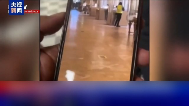 法国媒体“商业调频电视台”披露的一段视频显示,穿着黄色马甲的蒙面人正在用机器破坏展柜。这些蒙面人用角磨机打碎展柜,抢走文物,其间还用角磨机威胁博物馆保安。