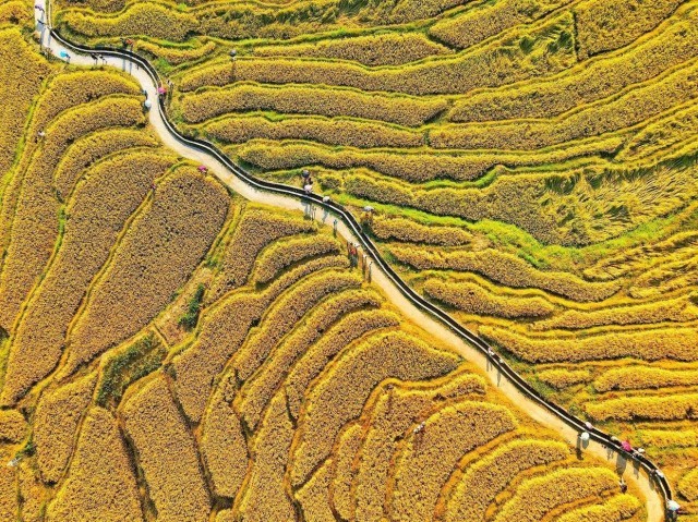 广东清远欧家梯田已是金黄一片,成熟的稻谷沿着山坡连绵起伏,从空中俯瞰,美如画卷。南方+记者 肖雄 黄津 摄