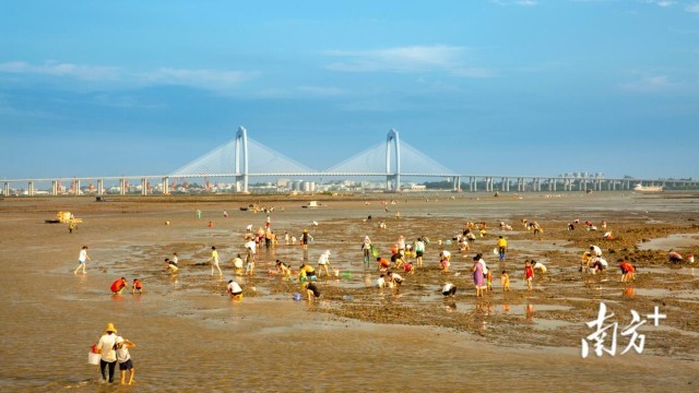 赶海的居民趁着退潮拾贝捉蟹,