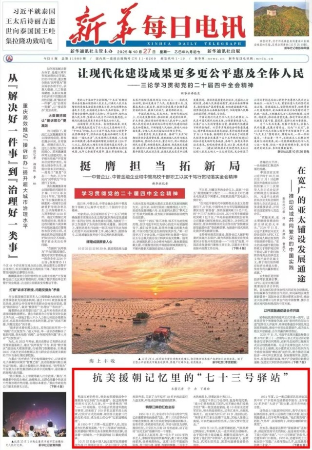 10月27日,《新华每日电讯》在一版刊文《抗美援朝记忆里的“七十三号驿站”》,对丹东市曾作为抗美援朝战争中连接前线与后方的“生命通道”进行了报道。