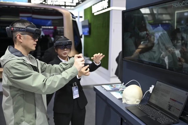 在2024年世界互联网大会“互联网之光”博览会上,参观者体验一款全息智能医学影像系统做手术的过程 图源:新华社