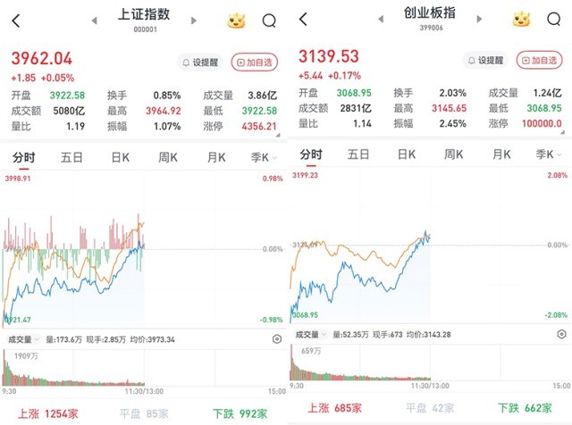 至午间收盘,上证综指涨0.05%,报3962.04点;科创50指数跌0.53%,报1379.94点;深证成指跌0.15%,报13155.62点;创业板指涨0.17%,报3139.53点。