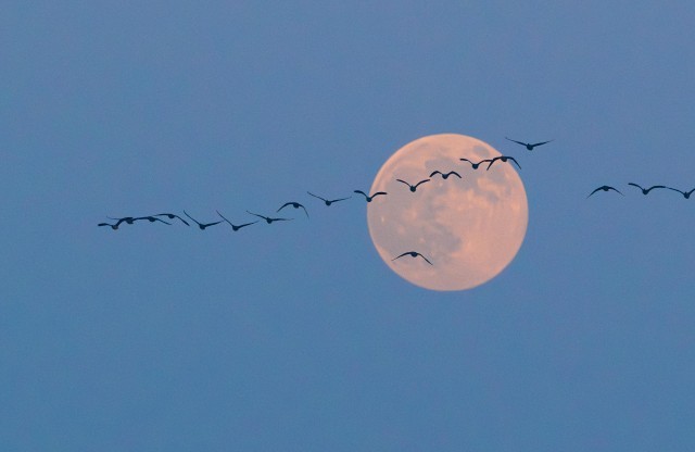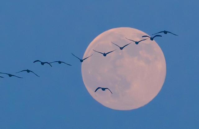 大雁与“超级月亮”邂逅 这一幕太惊艳