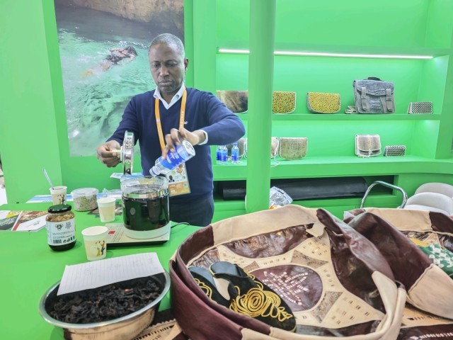 这也是他走进尼日利亚展台的原因。在这里,朱海发现了尼日利亚本地产的油莎豆还有洛神花茶。今天帮助朱海翻译的上海市志愿者协会进博会专业志愿者黄金慧告诉记者,今天在尼日利亚展台翻译最多的内容就是当地的多种坚果、皮具包袋的材质。