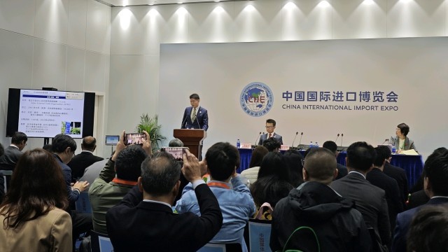 11月6日,中国日本商会在第八届进博会举办新闻发布会介绍参展日本企业情况。中青报·中青网记者 朱彩云/摄