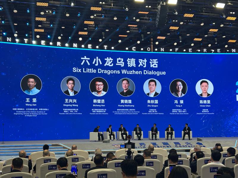 11月7日,在2025年世界互联网大会乌镇峰会主论坛上,宇树科技、群核科技、强脑科技、游戏科学、深度求索、云深处科技6家“杭州六小龙”企业的负责人首次同台对话。中青报·中青网记者 贾骥业/摄