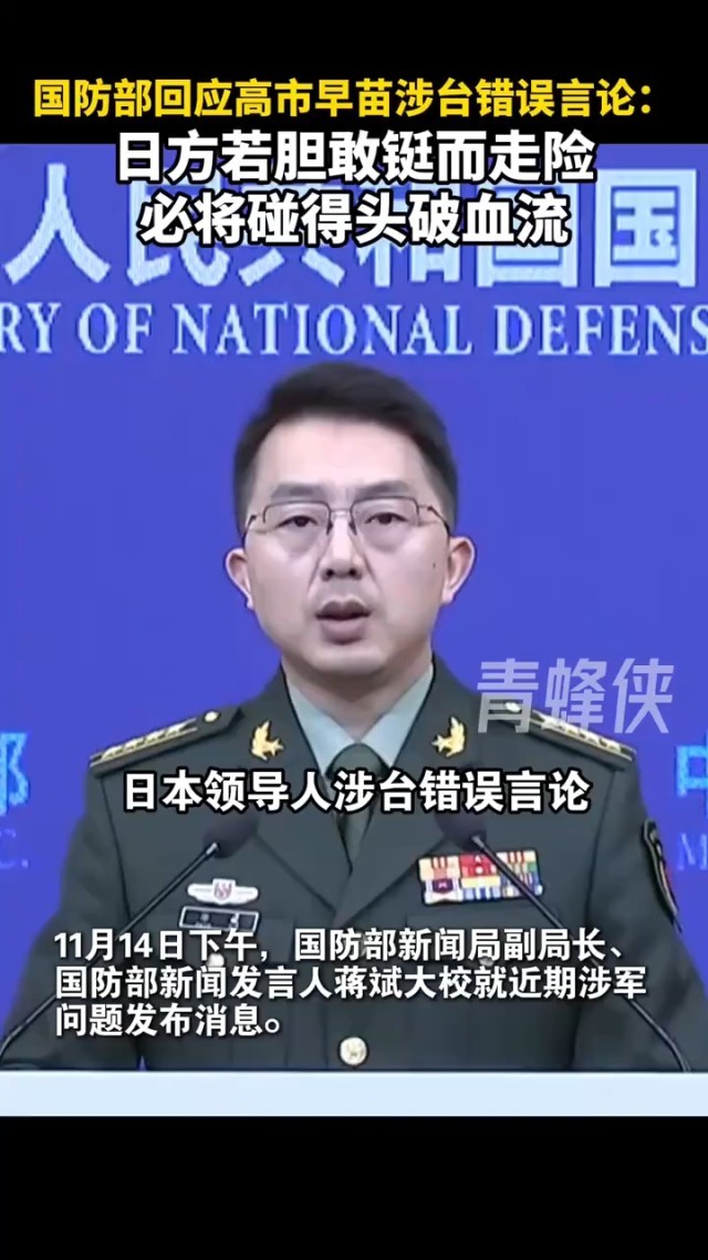 国防部回应高市早苗涉台错误言论:日方若胆敢铤而走险必将碰得头破血流