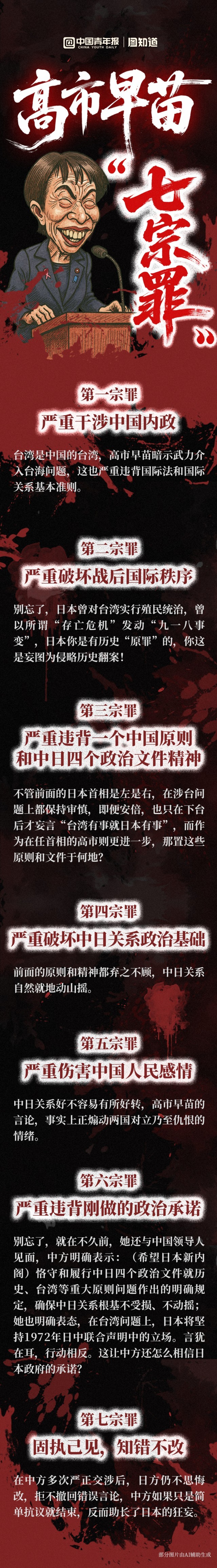 严重干涉中国内政,严重破坏战后国际秩序……高市早苗的罪行罄竹难书,“七宗罪”宗宗俱全,必将被中国人民和全世界爱好和平人民的怒火所吞没!
