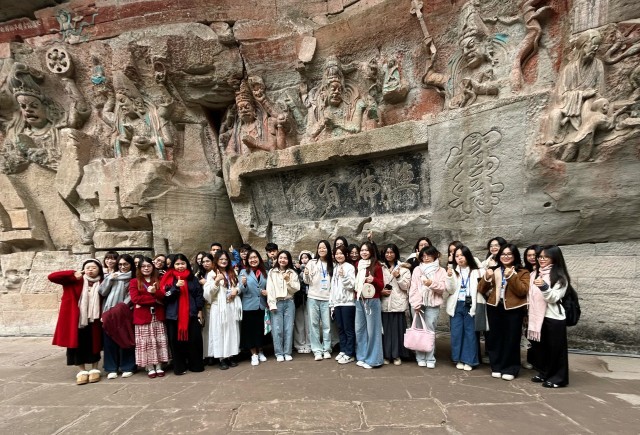 11月16日,重庆,越南青年参观大足石刻。中青报·中青网记者 李媛媛/摄