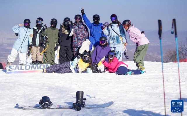 2025年1月27日,几名滑雪爱好者在新疆丝绸之路山地度假区合影留念。新华社记者王菲摄
