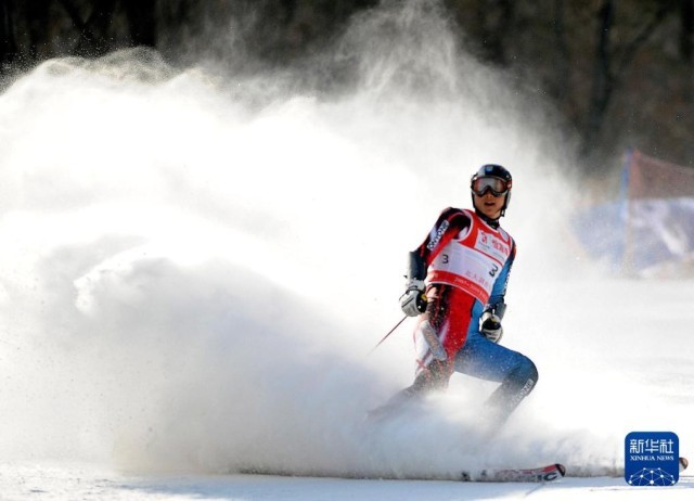 2008年2月28日,全国高山滑雪锦标赛男子大回转比赛在吉林市北大湖滑雪场进行,图为黑龙江省雪上训练中心选手李光旭在比赛中。新华社记者王昊飞摄