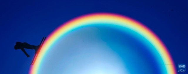 2012年1月7日,第12届全国冬季运动会自由式滑雪空中技巧规定动作的比赛在吉林市北大壶滑雪场举行。图为齐齐哈尔市队的女选手孔凡钰在比赛中进行空中翻转时,仿佛从太阳的光晕上滑下来。新华社记者费茂华摄