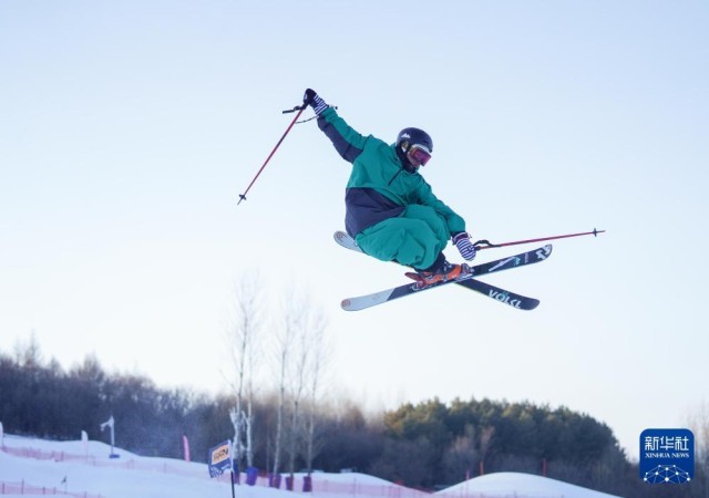 2024年12月31日,一名滑雪爱好者在吉林市万科松花湖度假区举办的滑雪趣味跳高赛中。新华社记者颜麟蕴摄