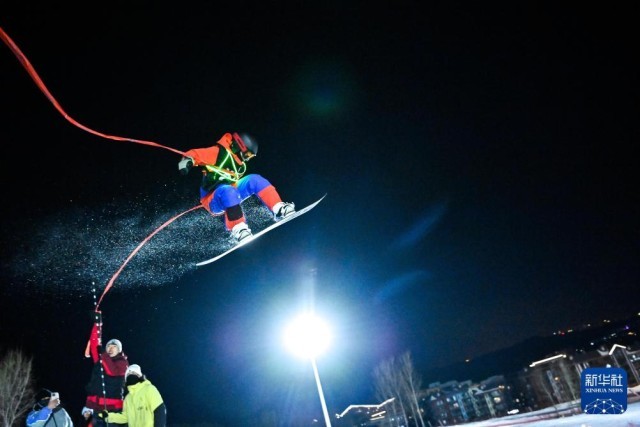 2022年12月10日,滑雪爱好者在位于吉林省吉林市的松花湖度假区V-PARK地形公园挑战跳台滑雪。新华社记者颜麟蕴摄