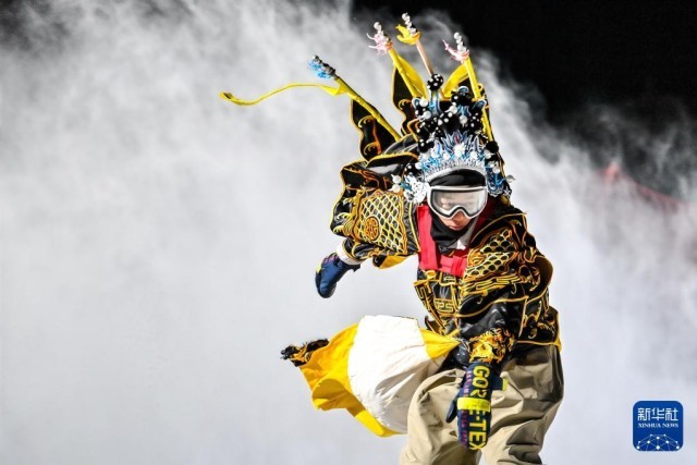 2024年12月12日,在吉林省吉林市松花湖度假区,身穿京剧服饰的滑雪爱好者在雪道上滑行。新华社记者张楠摄