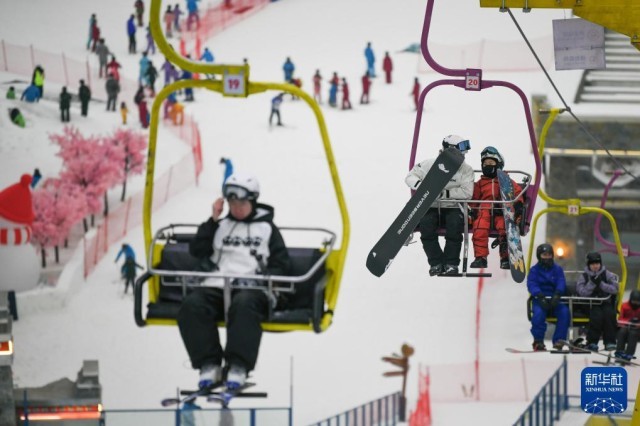 2025年1月12日,在成都热雪奇迹室内滑雪场,滑雪爱好者搭乘索道前往高级道。新华社记者胥冰洁摄
