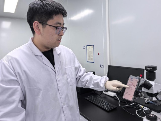 丹娜生物实验室里,研发人员展示新开发的真菌检测App。新华社记者杨文 摄