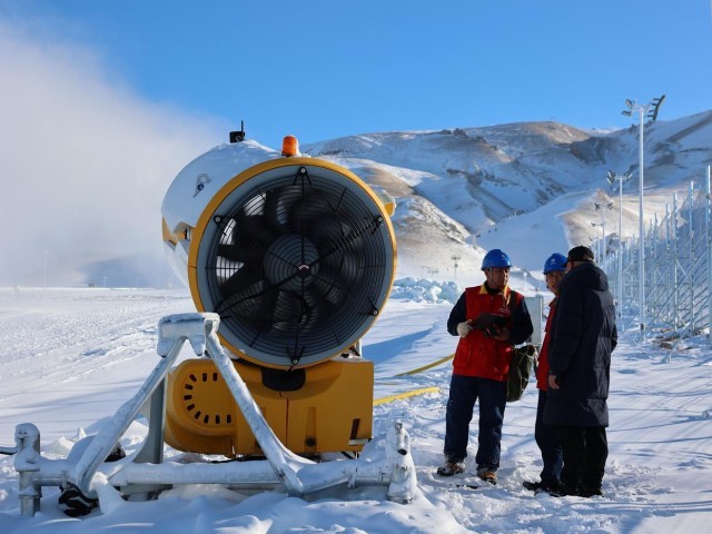 国网博尔塔拉供电公司工作人员对赛里木湖顶峰滑雪场进行用电设备检查。(奥吾东 摄)