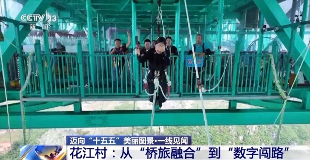 总台央视记者蒋树林介绍,花江村是传统的村落,因这座大桥的建成,村里增添了不少现代化设施,农家乐也通了5G。记者在沿途遇到了许多游客,他们一边拍照打卡,一边通过手机分享所见所得。