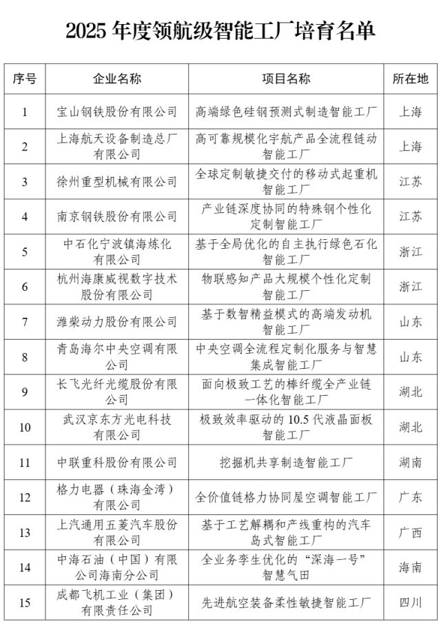 我国首批15家领航级智能工厂名单公布