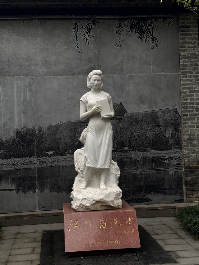 走进院内,一尊汉白玉雕塑引人注目:一名短发女学生身穿旗袍,捧着一本《普通植物学》,微微颔首,凝视着前方。碑座上刻有杨尚昆同志题写的“江竹筠烈士”五个大字。