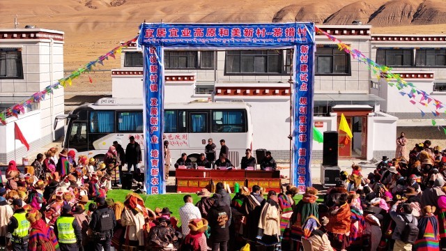 图为茶措村宜居宜业高原和美新村入住仪式现场,村民们身着民族服饰齐聚,现场正有序开展新居钥匙发放工作。改则县融媒体中心摄