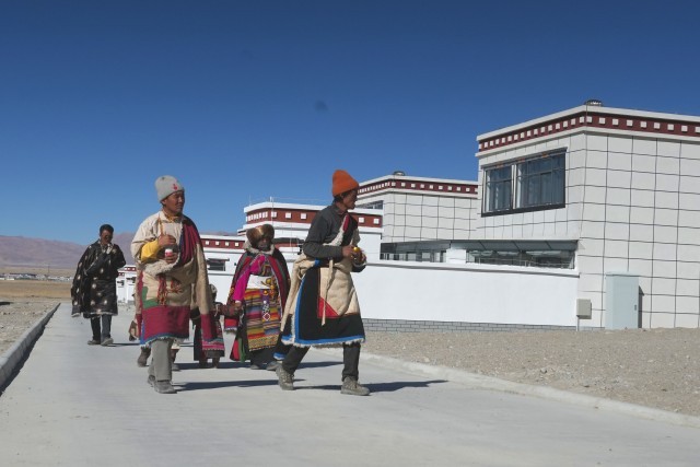 图为茶措村村民行走在新村平整的水泥路上,仔细辨认、寻找各自的新家,满是对新生活的期待。改则县融媒体中心摄