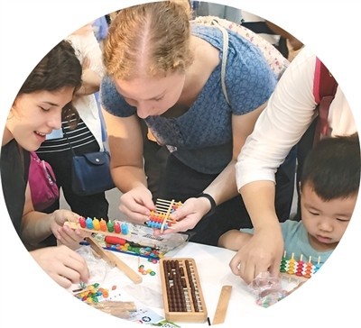 外国留学生在学习制作算盘。