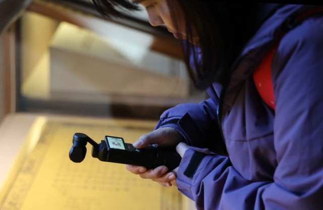 11月28日,在辽宁大连旅顺博物馆,媒体工作者拍摄展出的“明谕琉球国王敕”(仿制品)。新华社记者 李钢 摄
