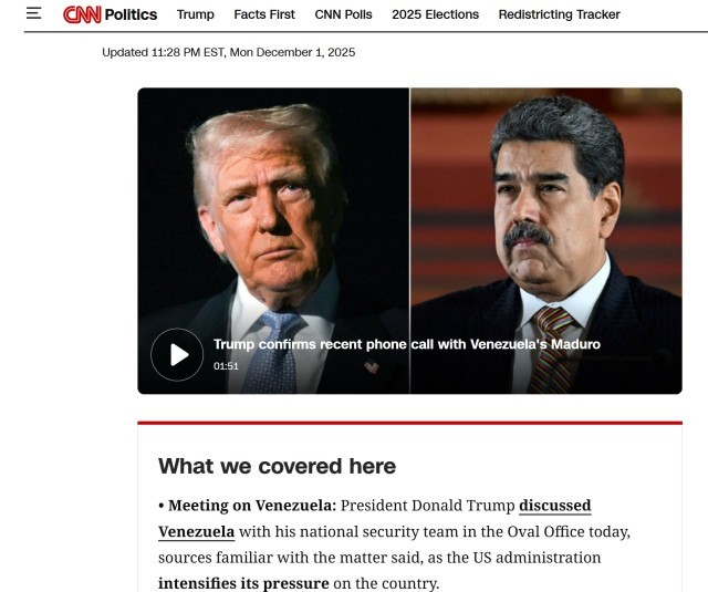 白宫没有在第一时间披露会议详情。相关报道指出,美军近期在加勒比海加强打击“贩毒船只”,并以“南方之矛”为行动代号,向委内瑞拉周边部署了包括“福特”号核动力航母在内的大量兵力。外界相信,特朗普政府将对委内瑞拉展现更强硬的姿态。