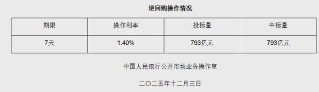 中新网12月3日电 据央行网站消息,2025年12月3日中国人民银行以固定利率、数量招标方式开展了793亿元7天期逆回购操作。具体情况如下: