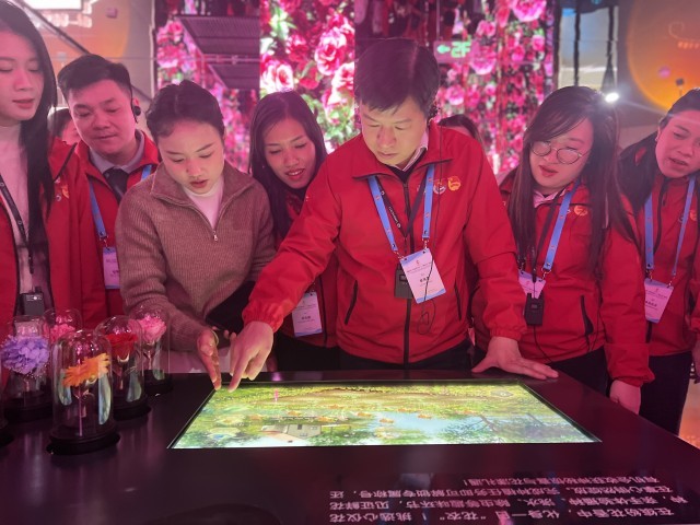 12月1日,云南昆明,越南青年参访中国斗南花卉展览馆。图为越南胡志明共青团中央常委、胡志明共青团中央青少年事务部副部长黎海龙(右三)在讲解员的指导下,体验数字技术模拟花卉种植流程,直观感受一朵花从种子生长绽放的全过程。中青报·中青网记者 赵婷婷/摄