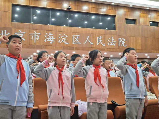 中国青年报客户端北京12月3日电(中青报·中青网记者 刘言)“我宣誓:忠于《中华人民共和国宪法》,拥护宪法权威,履行公民义务……努力成为党的好孩子、新时代的好少年;为实现中华民族伟大复兴的中国梦时刻准备着!”在12月3日,国家宪法日的前一天,北京市海淀区9所学校的200余名师生代表,走进北京市海淀区人民法院(以下简称“海淀法院”),在一堂生动的法治课后,面向国徽庄严宣誓,让法治信仰在心中生根发芽。