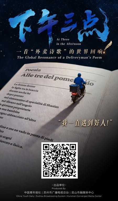 近日,《中国青年报》发布的视频短片《下午三点——一首“外卖诗歌”的世界回响》让“外卖诗人”王计兵的短诗《下午三点》再一次进入公众视野。视频中意大利留学生林明月在中国留学期间,读到了王计兵的诗《下午三点》,被诗歌中描述的普通人努力生活的态度与平凡的温情瞬间所打动,她决定将诗歌翻译成意大利语。就这样,一首中国小诗开启了跨国旅行,连接起了语言不同却情感相通的两国人民。
