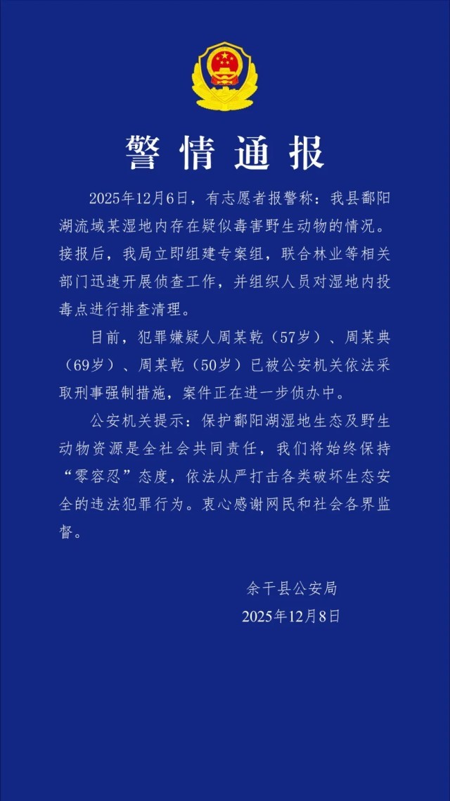 警方通报“鄱阳湖流域疑有人毒害野生动物”:3人被采取刑事强制措施