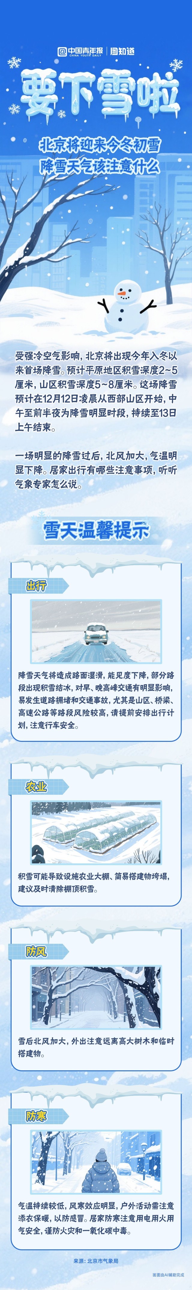 要下雪啦!12月12日至13日,受强冷空气影响,北京将出现今年入冬以来首场明显降雪。预计平原地区积雪深度2~5厘米,山区积雪深度5~8厘米。一场明显的降雪过后,北风加大,气温明显下降。居家出行有哪些注意事项,听听气象专家怎么说。
