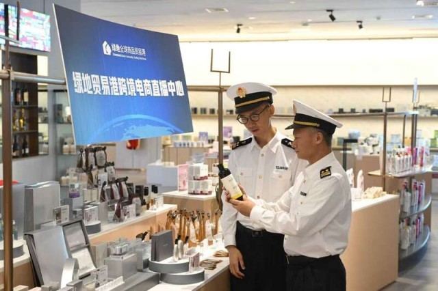 海关关员检查绿地贸易港的直播商品。上海海关供图
