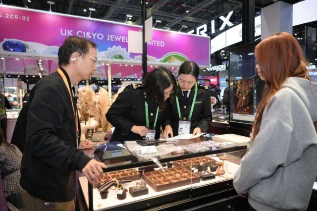海关关员检查进博会上的珠宝制品。上海海关供图