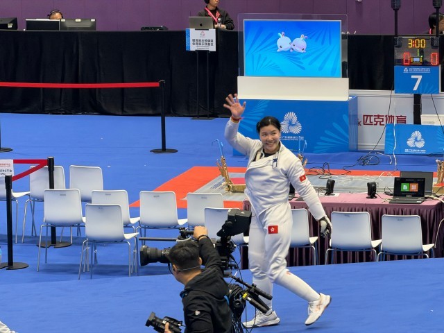 香港轮椅击剑名将余翠怡在赛后和观众招手。中青报·中青网记者 梁璇 摄