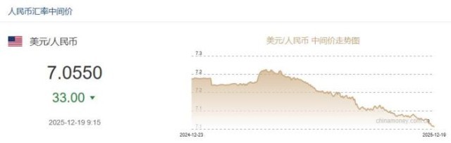 中新网12月19日电 据中国外汇交易中心网站消息,中国人民银行授权中国外汇交易中心公布,2025年12月19日银行间外汇市场人民币汇率中间价为:1美元对人民币7.0550元,上调33个基点。